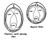 Chihuahua Chest The ribcage is an important structure, determining the room available for heart and lungs. There are 13 pairs of ribs, pivoting where they join the spine, and connected to the sternum by cartilage. The first nine pairs connect by cartilage directly to the sternum, the next three pairs are connected by cartilage to the cartilage of the rib in front, whilst the final pair are 'floating ribs' with no connection to the cartilage of the other ribs. These joints (bone/cartilage or cartilage/cartilage) allow the ribcage to expand outward with each breath, increasing lung capacity. The heart rests between the lungs on the sternum between the 3rd and 8th ribs. The ribs are set against the ribs and against the diaphragm - the muscle which runs diagonally from the loin vertebrae, down the rib walls, to the 7th rib and the sternum, separating thorax from abdomen. The action of the diaphragm creates a vacuum behind the lungs, greatly assisting breathing. The standard recognises the need for plenty of heartroom by requiring 'well sprung ribs, deep brisket'. The ribs should spring out in their initial curve away from the spine, but then flatten and lengthen slightly to deepen the chest, the length of rib and depth of chest best increases heart and lung room. If slab-sided, with little or no spring of rib from the spine and flat sides to the ribcage, room is restricted. Rounded, 'Barrel ribs' offer an illusion of room, but adequate depth of brisket could only be obtained with a disproportionately large ribcage. As well as depth and width, the ribcage should also be sufficiently long, so the brisket line should not cut up before the 7th or 8th rib. If the brisket line rises immediately behind the elbows, at the 3rd or 4th rib, the heart is pressed upwards, reducing lung room. Depth of brisket should be measured through the tip of the sternum, not merely between the foreigns. [ Next ]