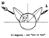 Chihuahua Ears Chihuahuas' ears are set on the side of the head rather than the top, and are carried erect, flaring out at an angle, often wrongly described as being at 'ten to two'. Particularly alert, or dozy, chis will naturally use their ears, pricking them higher, or laying them flat to the skull, but in repose should revert to the 45° angle. The ears are large, with rounded ends to the pointed tips, not to be confused with the rounded ends of the 'bat ears' of such as the French Bulldog. Because they are so large, Chihuahuas' ears sometimes take a while to become fully erect, the ears of teething pups are often soft at the tips, bending forward or back. Truly soft ears, those which fail to stand up, flop down beside the head and are both a serious fault in the show ring and a more likely victim of problems such as canker. Small, kitten ears set high on the head produce an alien, foxy, pommy expression and are sometimes difficult to weed out of breeding lines. [ Next ]